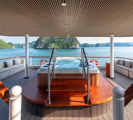 15:30 - 16:30 Thưởng thức Trà chiều Live Music trên sundeck trong khi thưởng ngoạn vẻ đẹp hùng vĩ của Vịnh Hạ Long hoặc ngâm mình trong bể sục Jacuzzi ngoài trời. Quý khách được phục vụ Canapes trên Sundeck và tự do đặt đồ uống mà mình yêu thích.