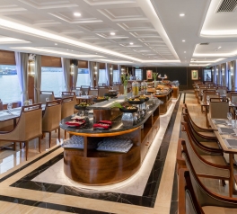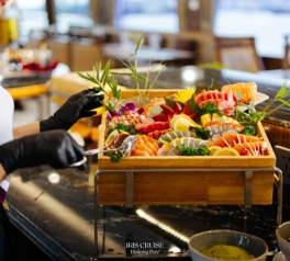 19:15 - 20:15 Phục vụ bữa tối thượng hạng trên Du Thuyền Iris, du khách sẽ được thỏa mãn mọi giác quan với tiệc buffet đa dạng Á – Âu lên tới 50 món. (*Dưới 25 khách: Phục vụ set menu)
